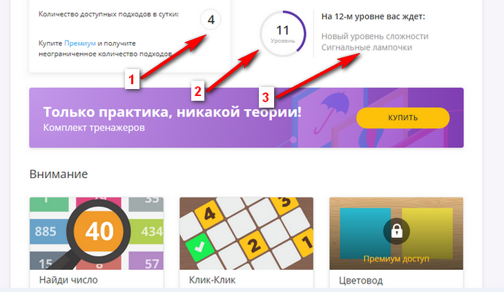 Всего на бесплатном варианте четыре, обязательных тренажера. Если заниматься ежедневно и в зависимости от ваших результатов вы попадаете на новый уровень сложности и с каждым уровнем, дается дополнительный тренажер.
