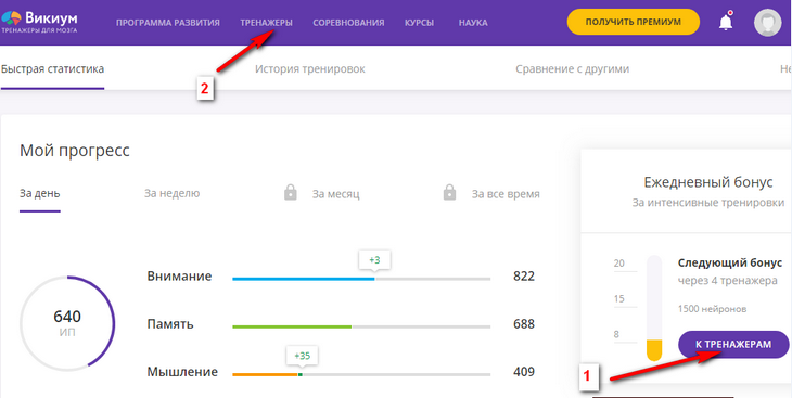 Если вы нажмете кнопку – посмотреть статистику, вы попадете на страницу “Мой прогресс”, где будут видны результаты сегодняшней тренировки и справа ежедневный бонус за интенсивные тренировки.