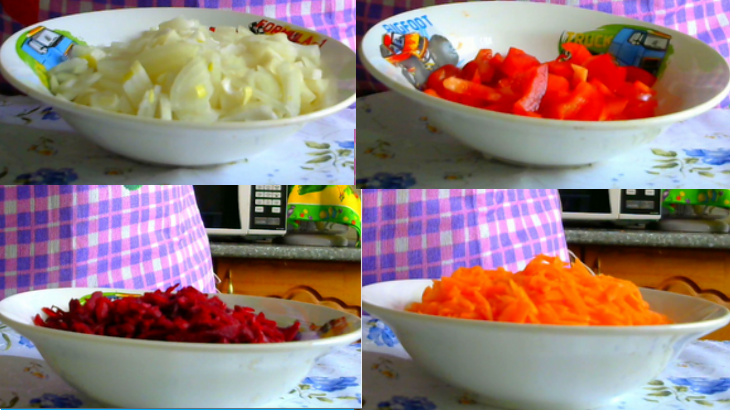 Морковь очистить, помыть натереть на крупной тёрке. Свеклу очистить, помыть натереть на крупной тёрке. Болгарский перец помыть, очистить от семян, удалить перегородки, нарезать соломкой. После того, как лук потушился, добавляю морковь, затем я добавляю свеклу, в самом конце, добавляю болгарский перец.